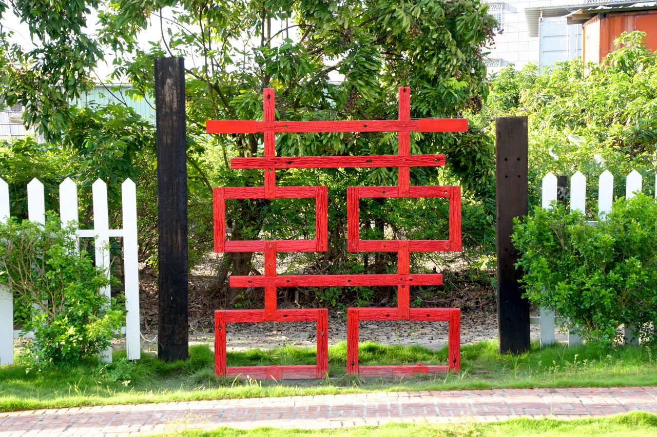 牛稠子車站入口處左手邊的裝置藝術:巨大的「囍」字。