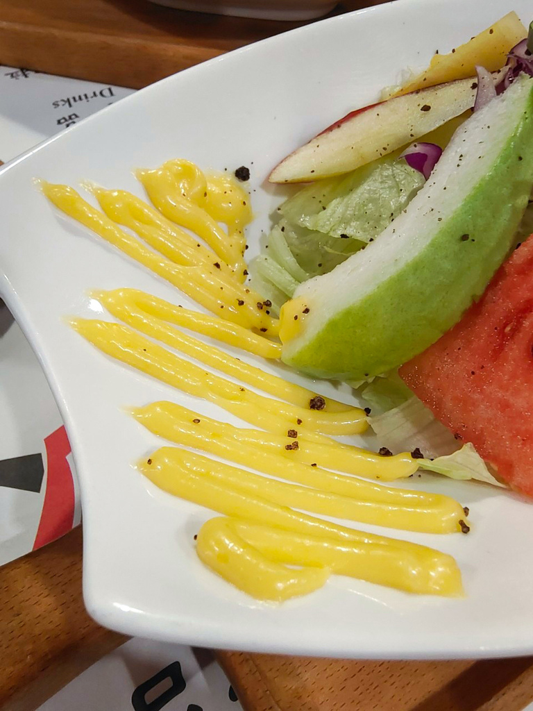 超大一盤的生菜沙拉,份量可沒在跟你意思意思一下,最上層是當季新鮮水果,甜度、水份都很足夠,吃起來清爽又清甜