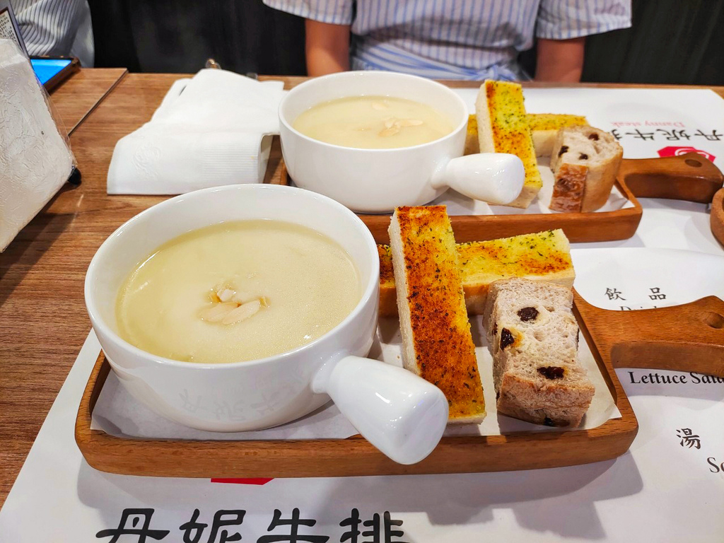 一邊享用附餐,坐我對面的Cora不斷實況轉播,說我後方的男生又續了濃湯麵包,哇賽!又續了一次,總共三次!!真心佩服對方的大胃,不過濃湯和麵包口味真的滿好吃的,喜歡吃的人不要客氣XD但記得要留肚子給主角牛排!