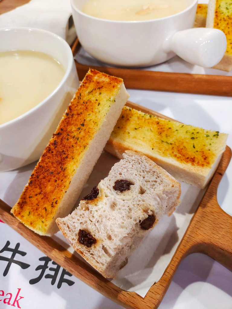 奶油蘑菇濃湯、蒜香麵包、葡萄乾麵包