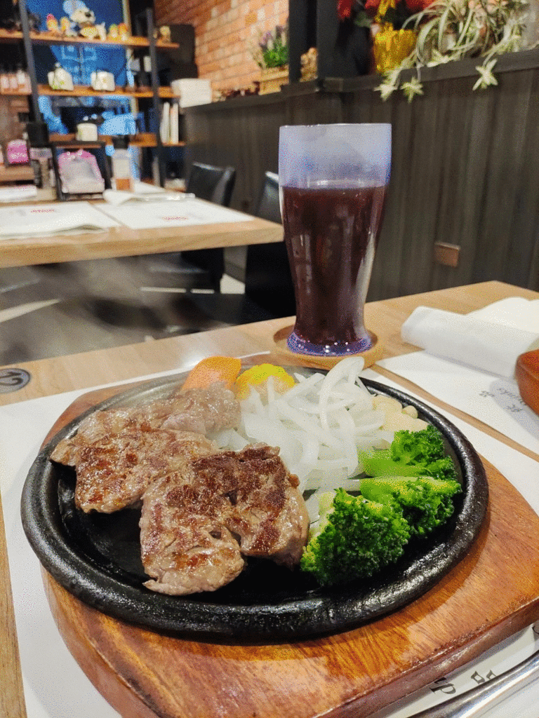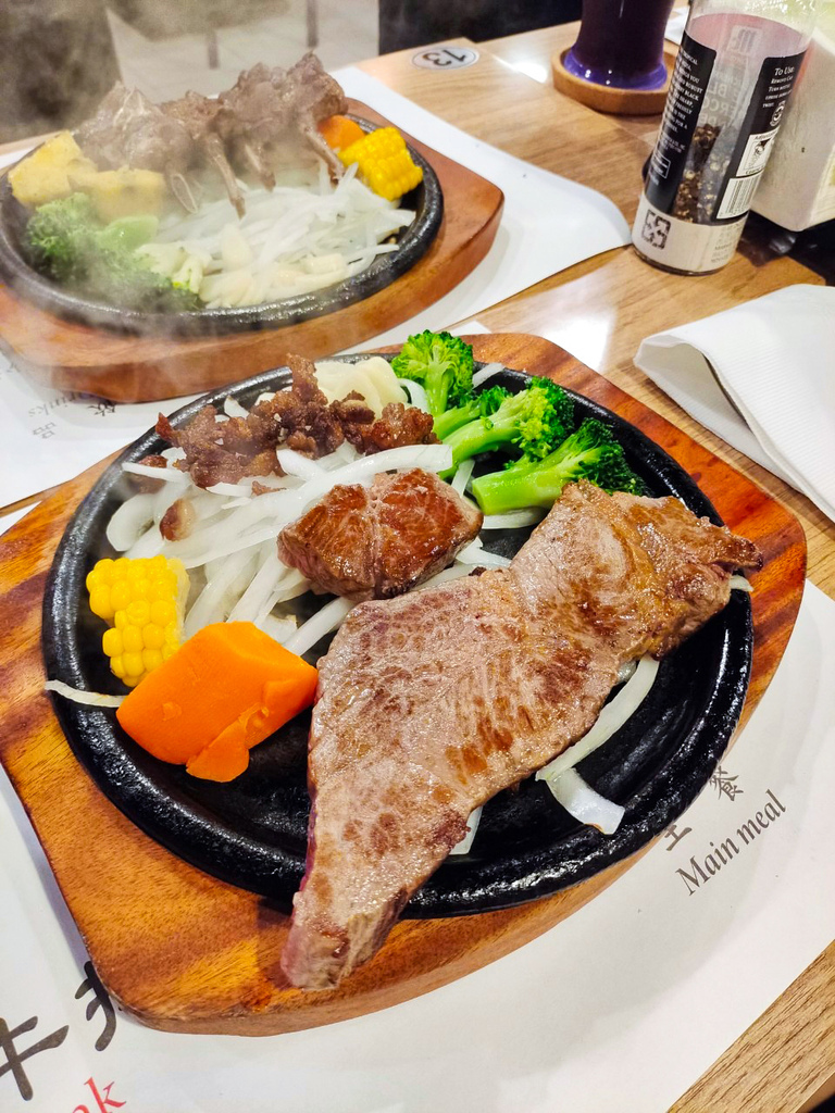 快要大出鐵盤的背肩牛排,一端上來朋友Cora就被份量shock到,而且厚度也是滿厚的,一般來說吃平價牛排,如果牛排大、那就薄,丹妮牛排沒有這種狀況,牛排就是又大又厚,完全滿足肉食慾
