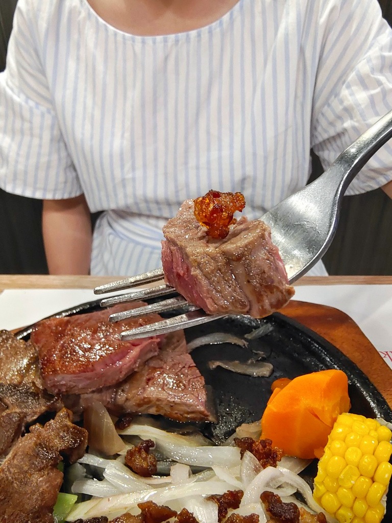 ▼Cora切了一塊又疊了一塊,才有空間切牛排。背肩推薦大家點7分熟,這個部位本來就挺有嚼勁,喜歡咀嚼肉感的人可以嘗試看看。我本身是比較喜歡嫩感的牛排,但吃這塊我還滿喜歡的,油脂豐富配上有勁度的肉質,特別有吃牛肉的真實感