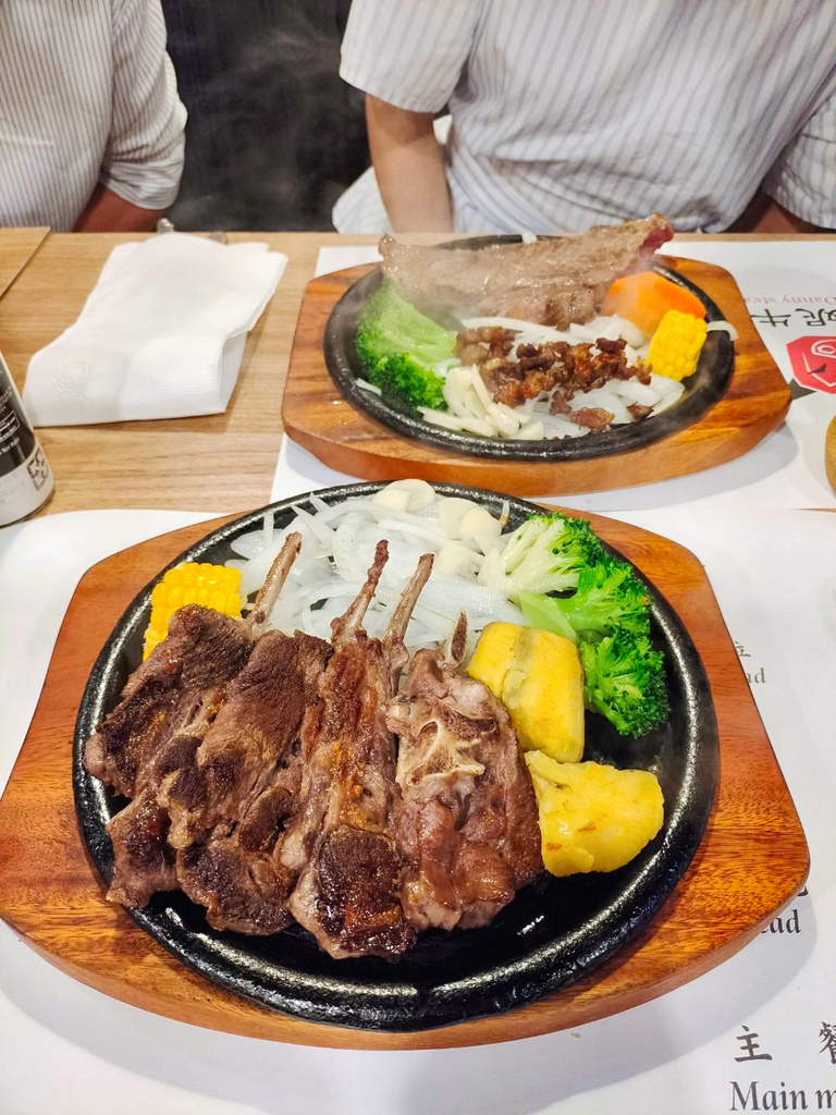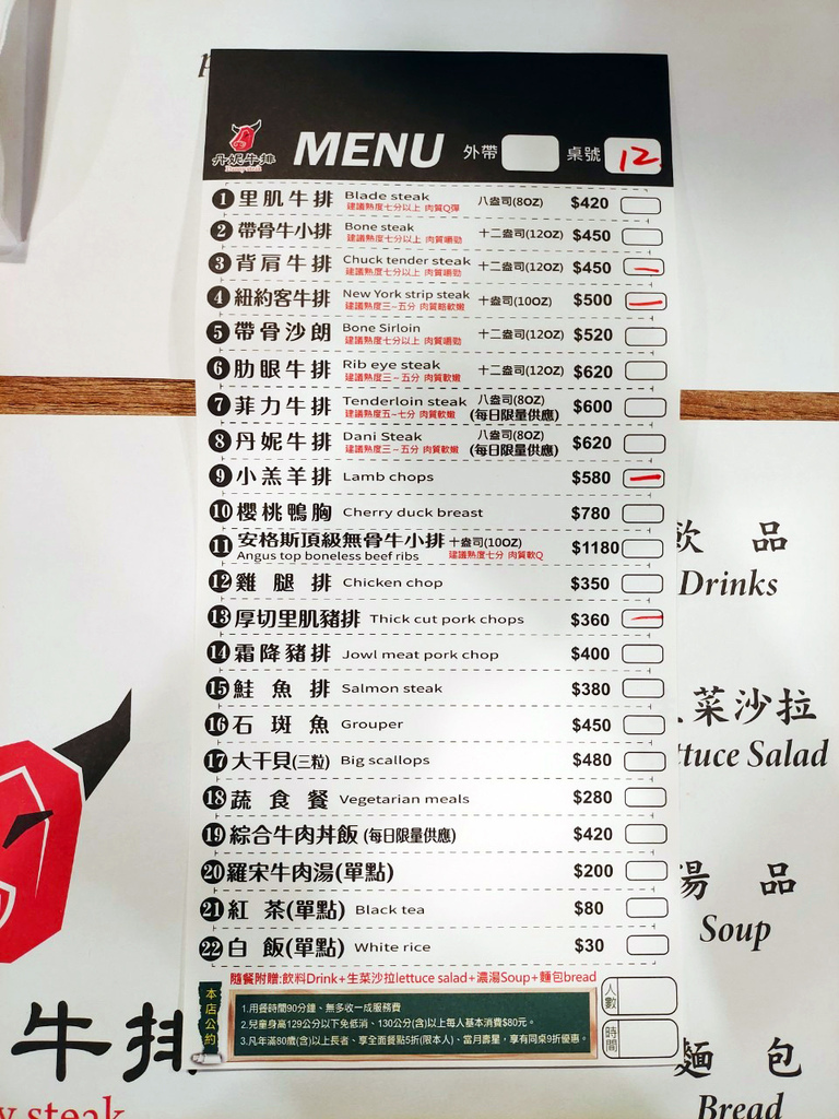 ▼我們四人點了:背肩牛排、紐約客牛排、小羔羊排、丹妮牛排(結帳時店家說今天還有丹妮牛排,所以就把厚切里肌豬排換掉)