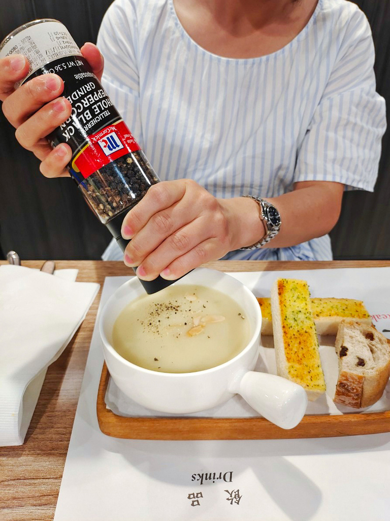 ▼奶油蘑菇濃湯鹹度適中,奶味濃郁,撒上一點黑胡椒,微微的辣味,一下子就喝到碗底了