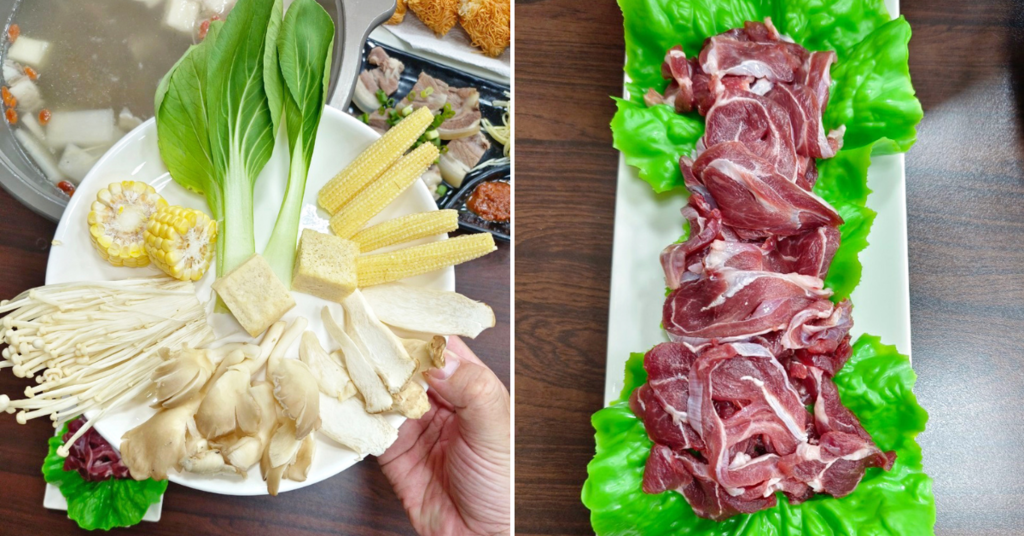 ▼爐底附的蔬菜盤和溫體羊肉盤