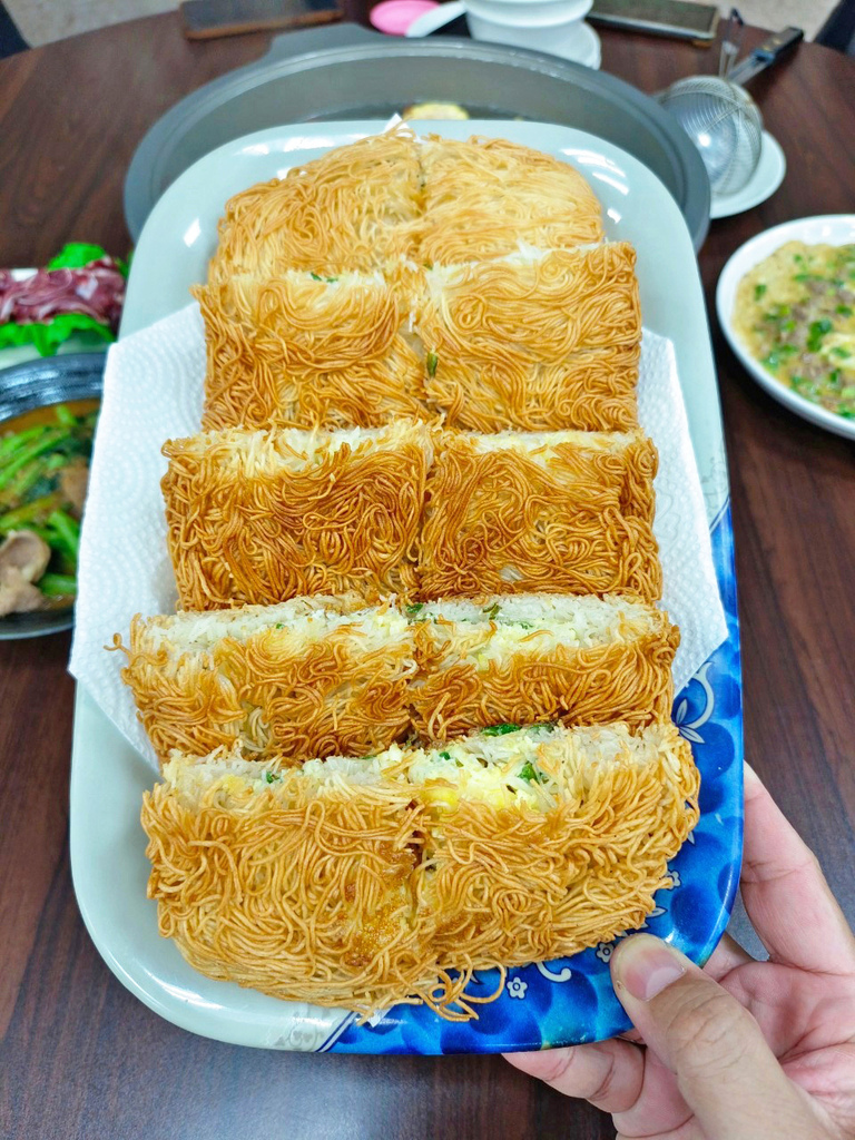 ▼把燙熟的麵線像蛋餅一樣油煎,最外層非常酥脆、口感就像科學麵,裡面厚度很厚、濕潤,我弟說吃起來很像東北大餅,外面脆、裡面鬆軟