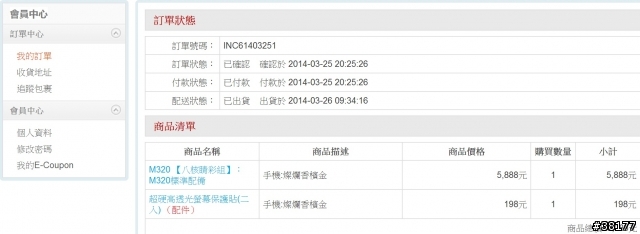 單編號 (Order Number) 1403260515******交易時間 (Store Name) 2014/03/26 05:19:22商店名稱 (Store Name) 康法科技股份有限公司商品明細 (Merchandise Details) 網路商品一批總金額 (Total Amount) 6,356 元付款方式 (Payment) 信用卡昨天整天無法購買 半夜起床終於買到了