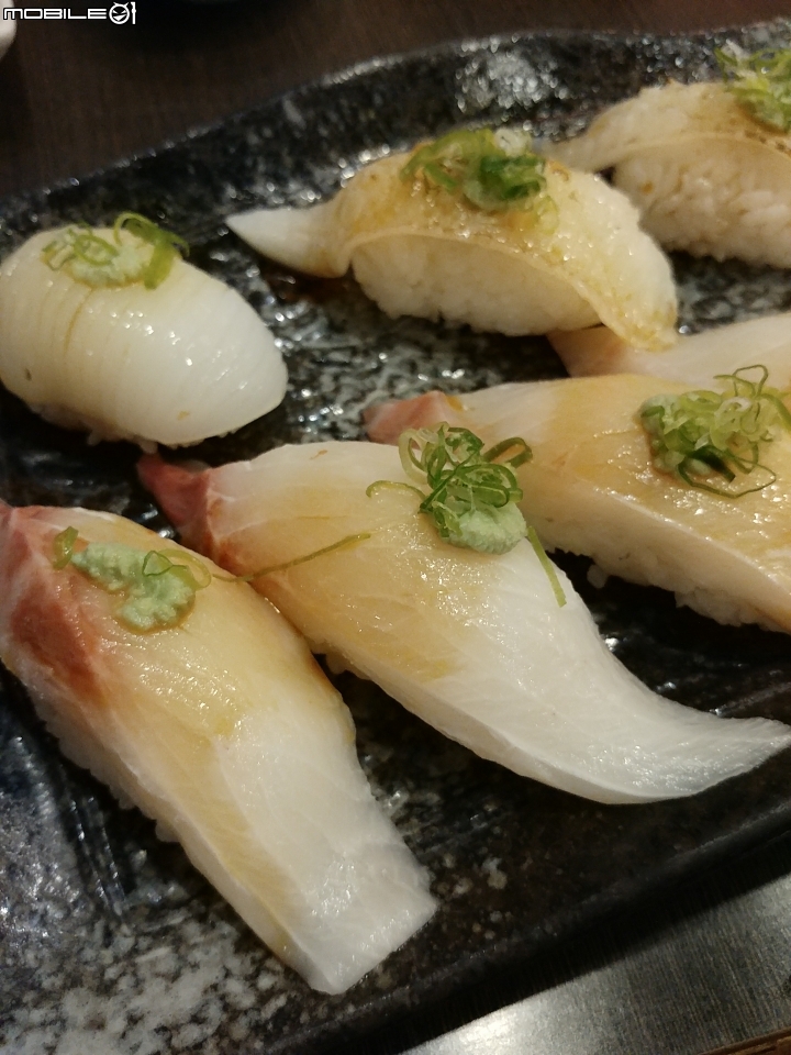 生握壽司的部分,我們所選擇的鮭魚和生花枝,鮭魚油脂較多,配合蔥花吃起來剛好解油;生花枝吃起來較為清淡爽口,兩者肉質也是鮮嫩無比。