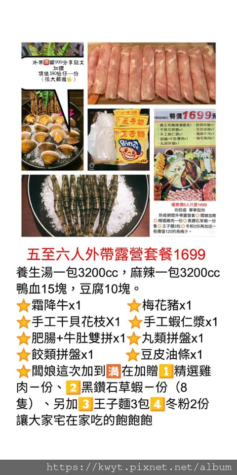 WOW!1699元的五至六人外帶露營有附兩大包各3200c.c.的湯,加上12種食材,滿額還有加贈烏梅汁一瓶,湯品、豐富食材、搭配火鍋一起享用的飲品通通有,實在太~~~超值!
