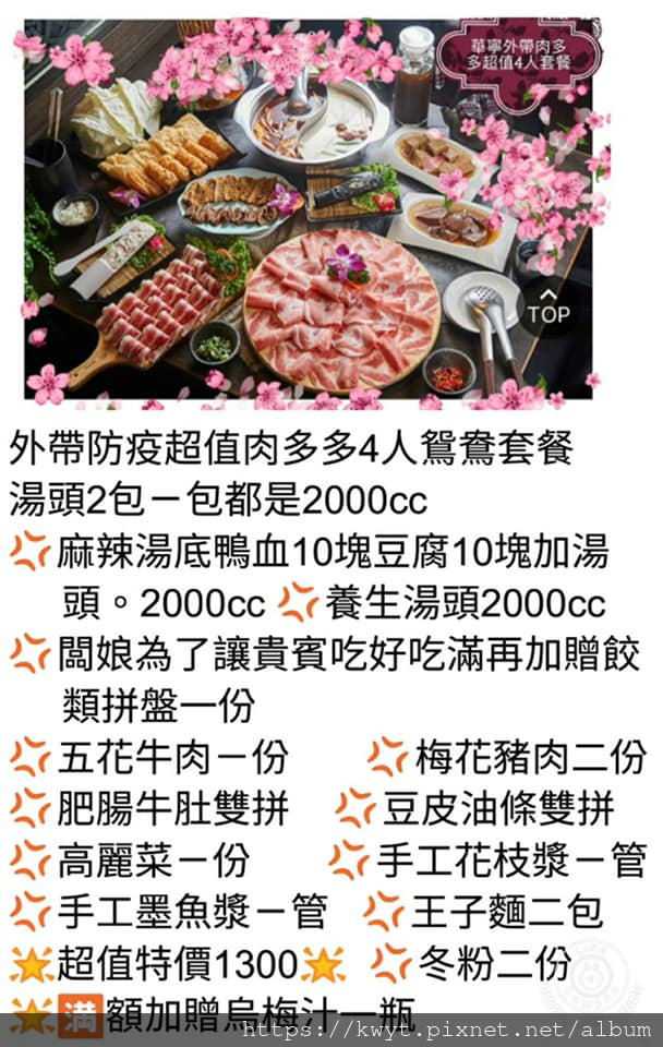 四人超值肉多多套餐1300元(招牌麻辣與養生兩種湯頭各2000c.c.)