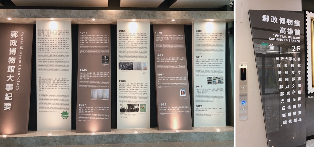 量體溫、實名制後即可入內。右側牆上是「郵政博物館大事紀要」, 搭乘電梯即可到達郵政博物館高雄館。二樓的展示空間包含了郵政大事紀要、經典珍郵、綺麗方寸、異國郵情、郵政文物、郵票特展、光雕投影、送信體驗、窗景動畫、環景劇場。Rikki的參觀建議時間是1.5~2小時。
