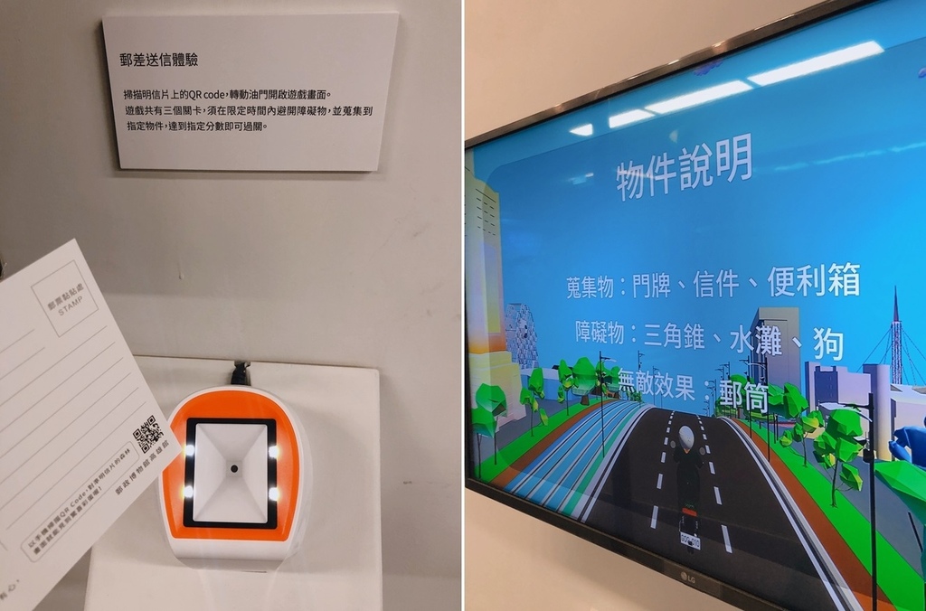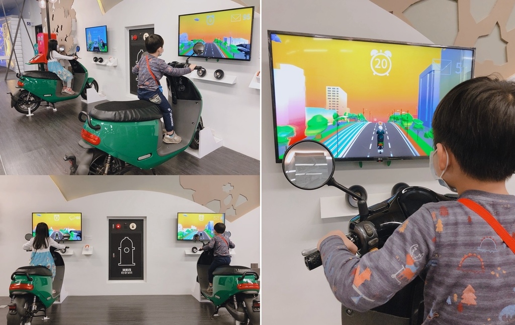一進到展館,兩隻寶就說要先騎gogoro,明明參觀動線這是最後一站呀。那就先玩這個吧~ 掃描明信片上的QRcode,轉動油門後就能開啟遊戲了!共有三個關卡,對小小孩來說其實都蠻容易的。