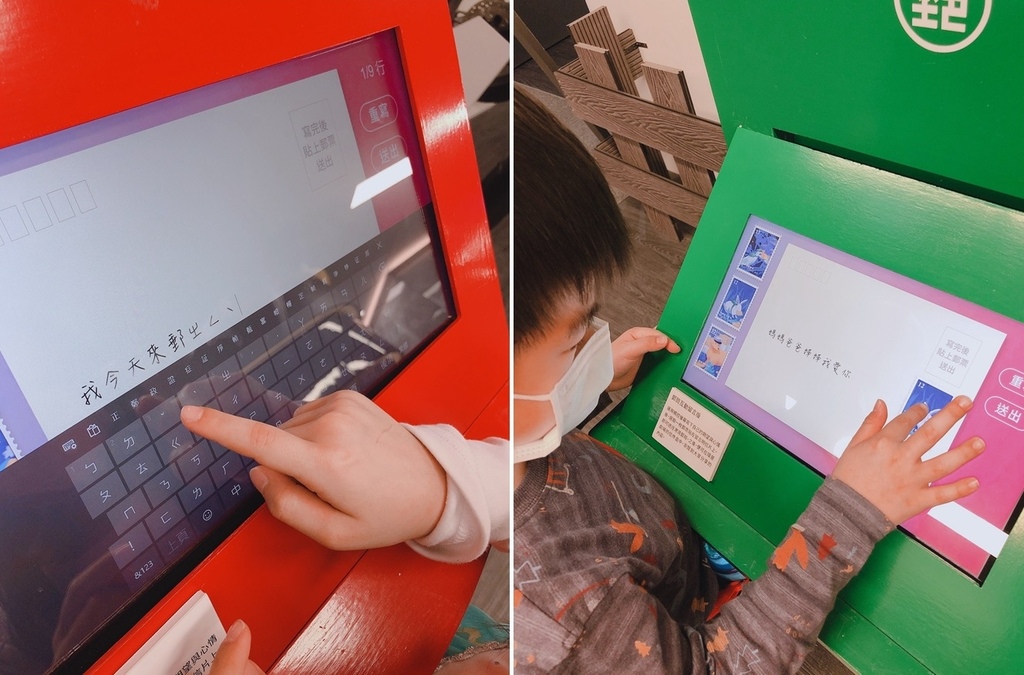 可愛的紅綠色郵筒~ 前面是寫卡片的地方,打好文字,選張郵票就能寄出信件囉~