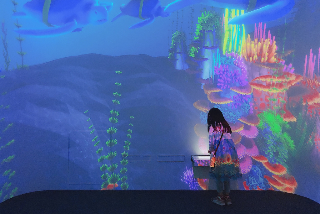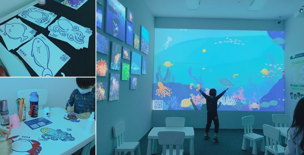 一旁還有畫畫互動的區域,一共有四款塗色卡,畫完掃描就能投影到牆上。