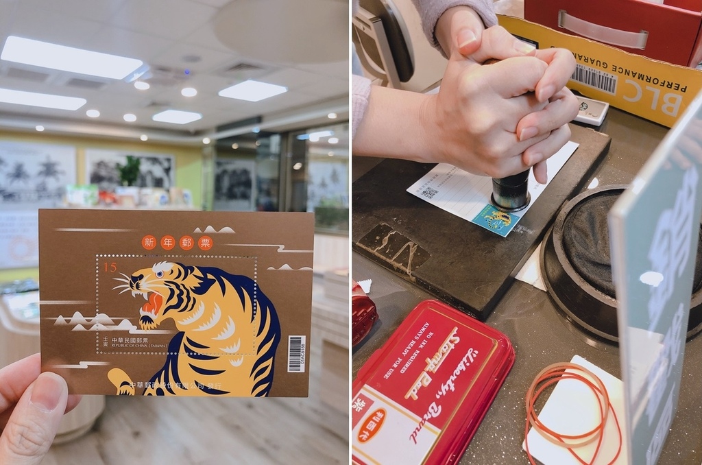 今年的新年郵票好好看,我自己屬虎,當然要買張來收藏囉~ 兩隻寶各挑了一張5元的郵票來貼明信片,這樣就能蓋癸字郵戳囉。