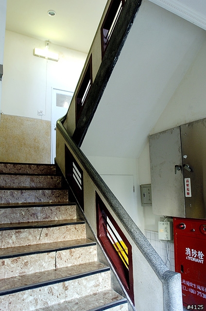 磨石子的樓梯扶手,中空的地方,鑲嵌著木柴材質,記憶中的舊建築都差不多是長這樣,難怪這棟建築中的套房稱為懷舊套房呢。