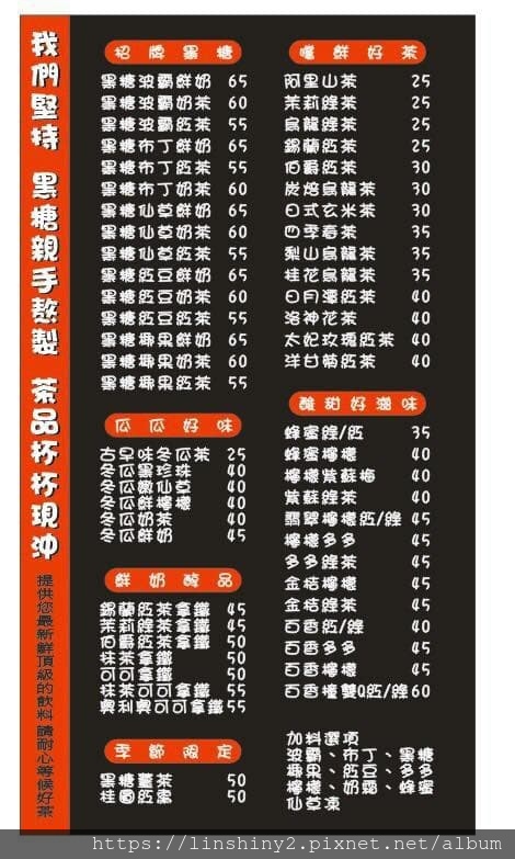 店內主打的是手搖界飲料很火紅的黑糖系列,這黑糖可是可以每日手炒、親手熬煮的好滋味。另外也有不愛奶類的朋友們,店內也是有茶類飲料可以選擇。這茶葉可是老闆娘嚴選南投在地茶葉,杯杯現沖而成。