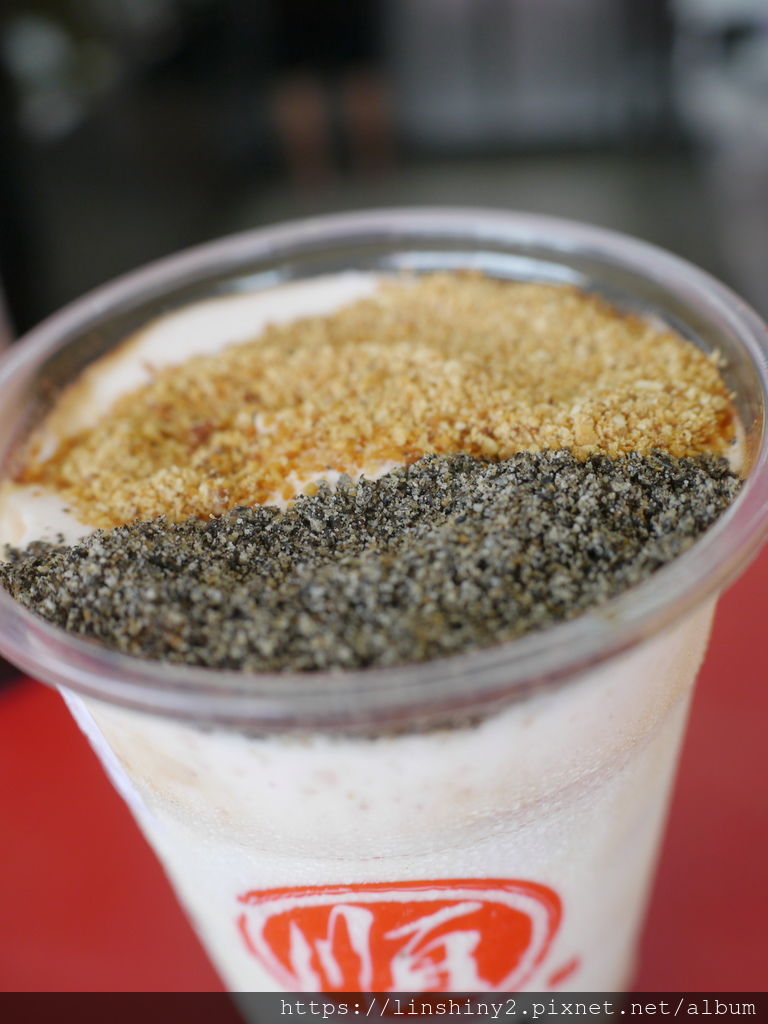 沒拿到飲料前一直以為就是一般常見的黑糖珍珠奶,直到店家端出飲料放在檯面上才知道大錯特錯。除了手炒黑糖加上光泉鮮奶常見的組合外,上面可是有加入芝麻粉跟花生粉兩種神奇組合。而奶茶與穀粉的中間可是有一層綿密奶味濃郁的玫瑰奶霜,加上底層Q彈軟嫩的波霸,一口喝下可是有多種層次的口感。