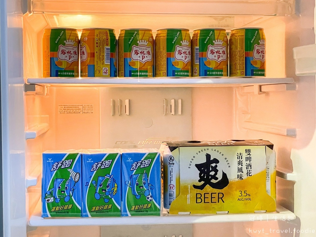 冰箱內的舒跑、氣泡類飲品、啤酒皆可自由飲用。