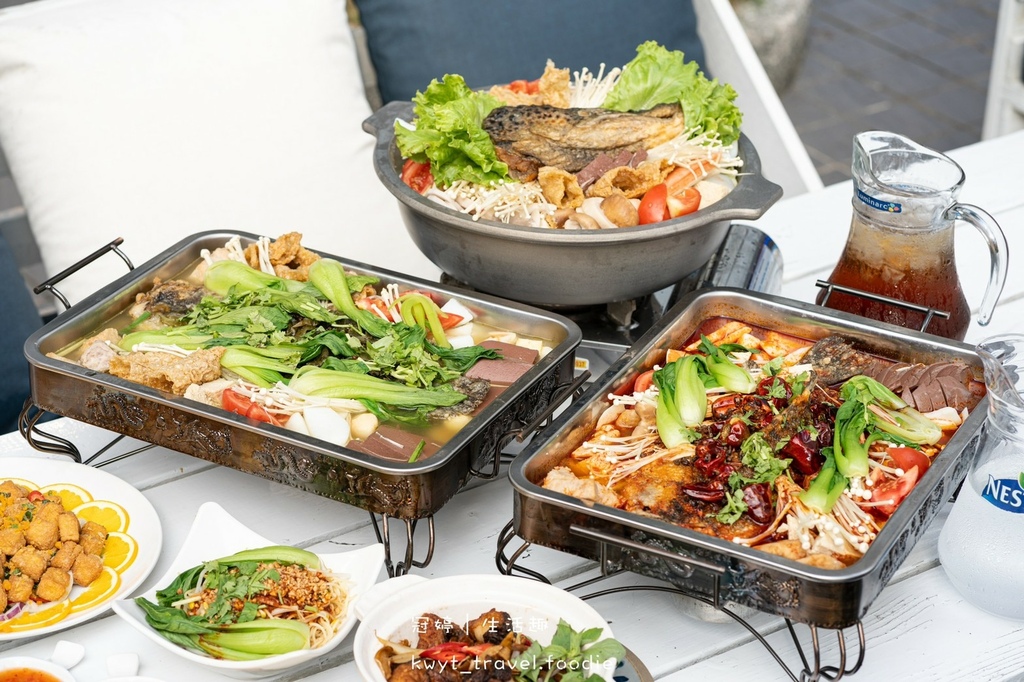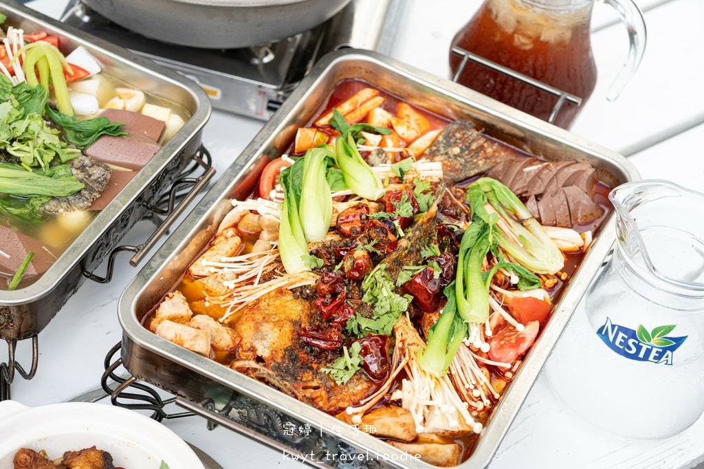 以整尾鮮魚作為主角,輔以青江菜、白蘿蔔、香菜、芋頭、牛番茄、蓮藕、馬鈴薯、金針菇、香菇、秀珍菇、鴨血、凍豆腐、火鍋料、豆皮等多種食材呈現,完美復刻重慶烤魚。
