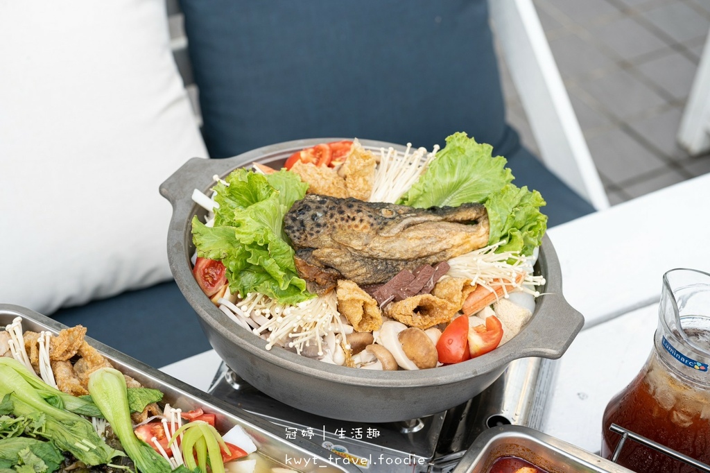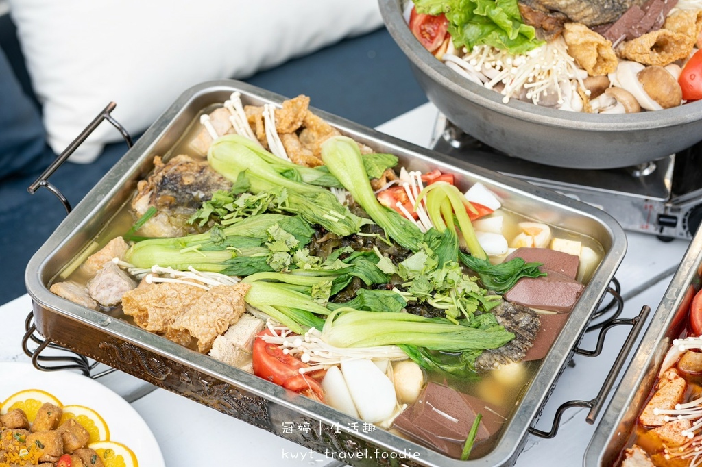魚 / 老甕酸菜 / 青江菜 / 白蘿蔔 / 香菜 / 芋頭 / 牛番茄 / 金針菇 / 鴨血 / 凍豆腐 / 火鍋料 / 豆皮