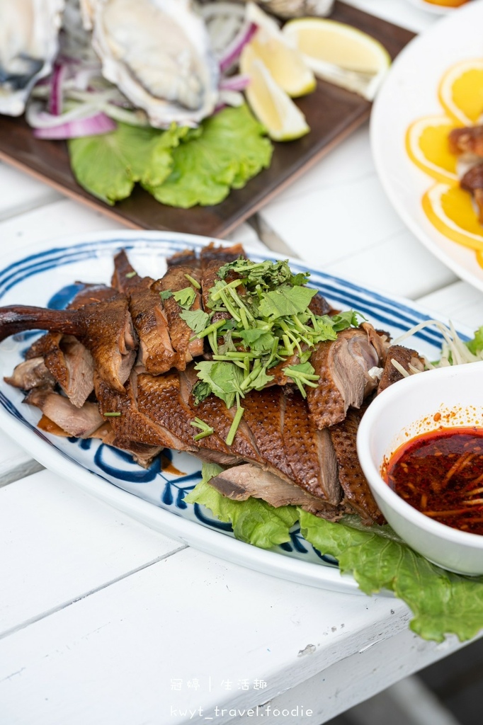 煙燻過的鴨皮色澤很均勻,一口咬下感受鴨肉特有軟中帶Q的咬勁,與分佈均勻的油脂,加上在嘴裡散發的鴨油香氣,煙燻之後油而不膩、自帶迷人煙燻香的美味,讓人一塊接一塊吃起來,完全停不下來。