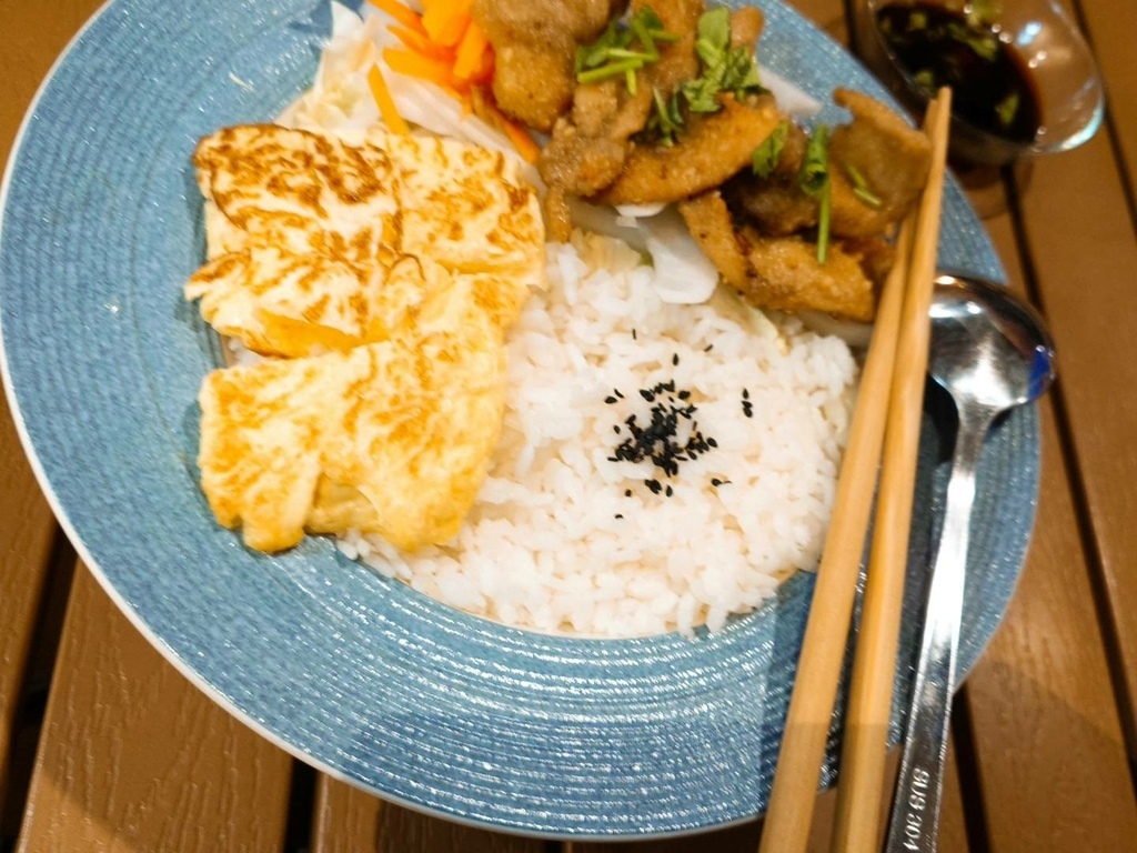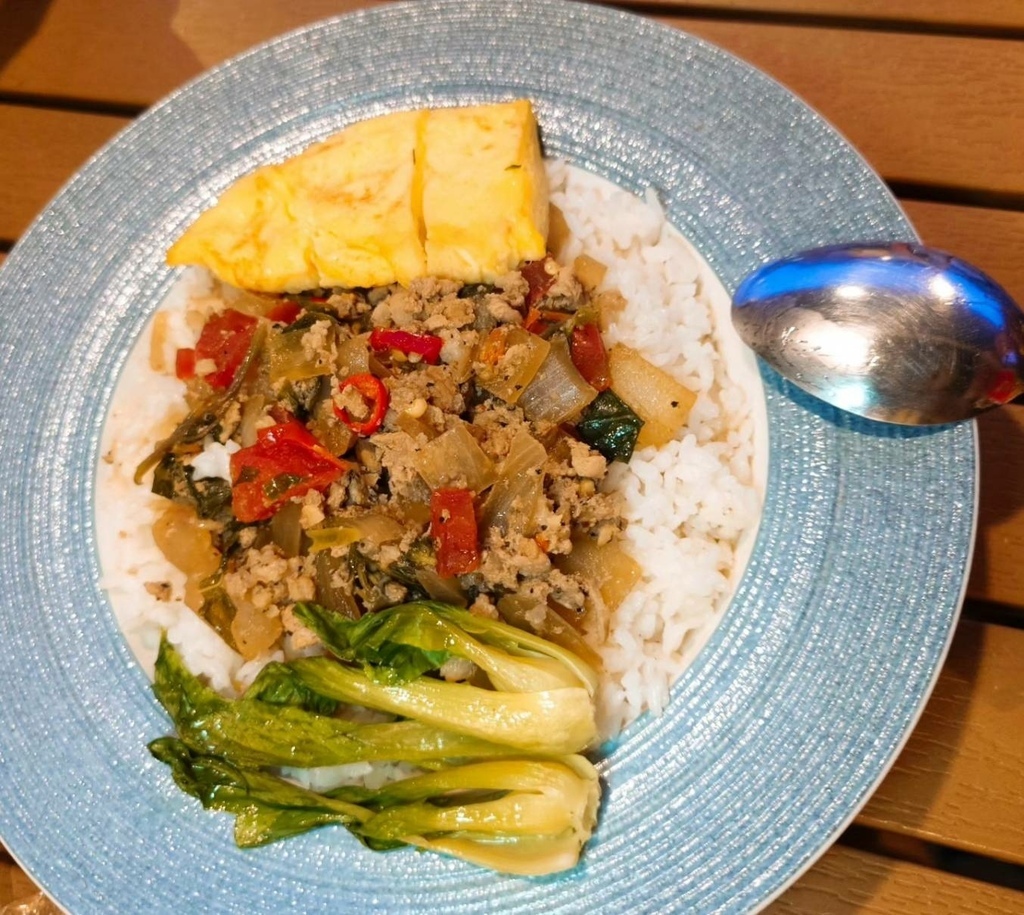 白飯超多,打拋豬飯份量大也很辣,對於胃口大的男生可以加點原味蛋餅,蛋餅是有點像歐姆蛋的粉漿蛋餅,包覆著滿滿的蔬菜~