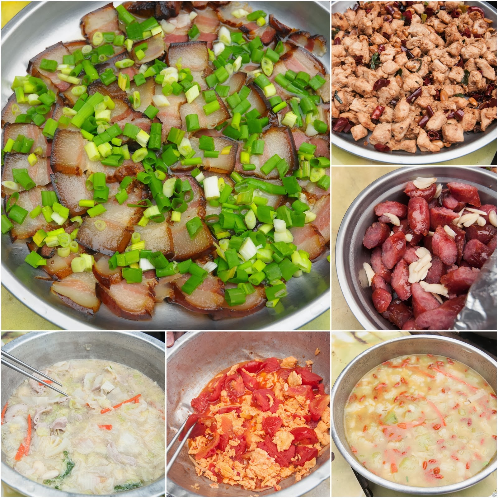山豬肉,辣子雞丁,大蒜香腸,番茄炒蛋,枸杞絲瓜還有白菜百菇湯,這真是太奢侈了!!