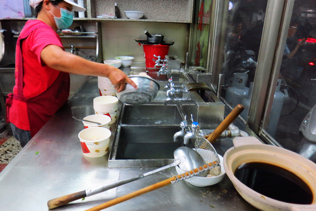 〔液香扁食店〕的料理檯上,衛生紙碗經常是一排排的擺著,工作人員的雙手一刻不得閒。