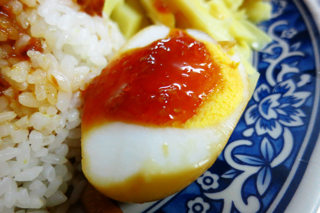 除了三樣配菜,還奉送這顆淋醬半熟的「黃金蛋」,可是,只有半顆,根本不過癮啦!