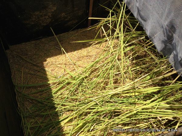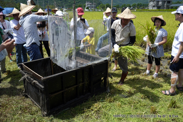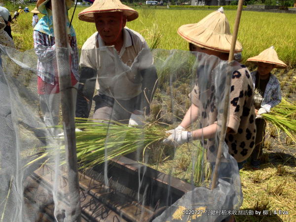 由專業農夫負責踩打穀機,我們只是把稻子放進去而已。