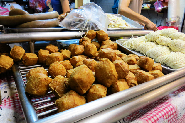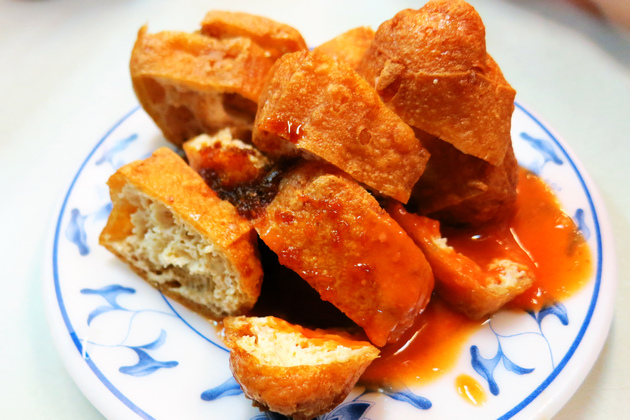在宜蘭傳統麵攤,經常可見這種澎澎的炸豆腐(閩南語:豆干繼),一份20元,外硬內軟。