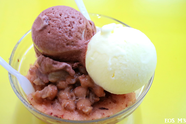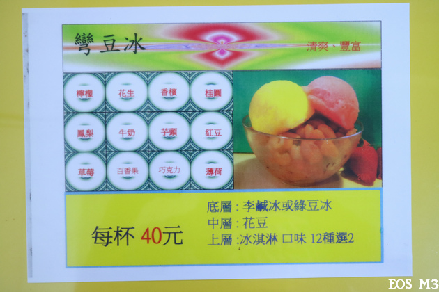 彎豆冰:底層可選李鹹冰或綠豆冰,中層是主角花豆,上層放兩球冰淇淋(12種口味選2)。