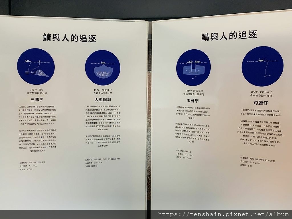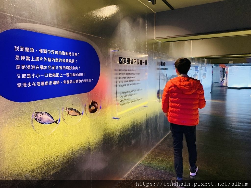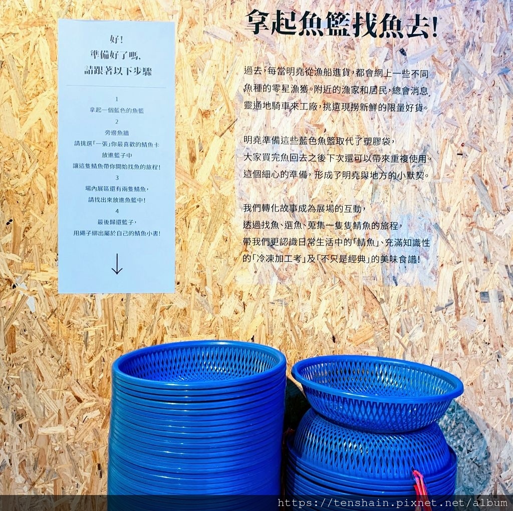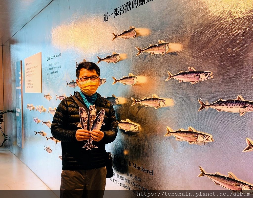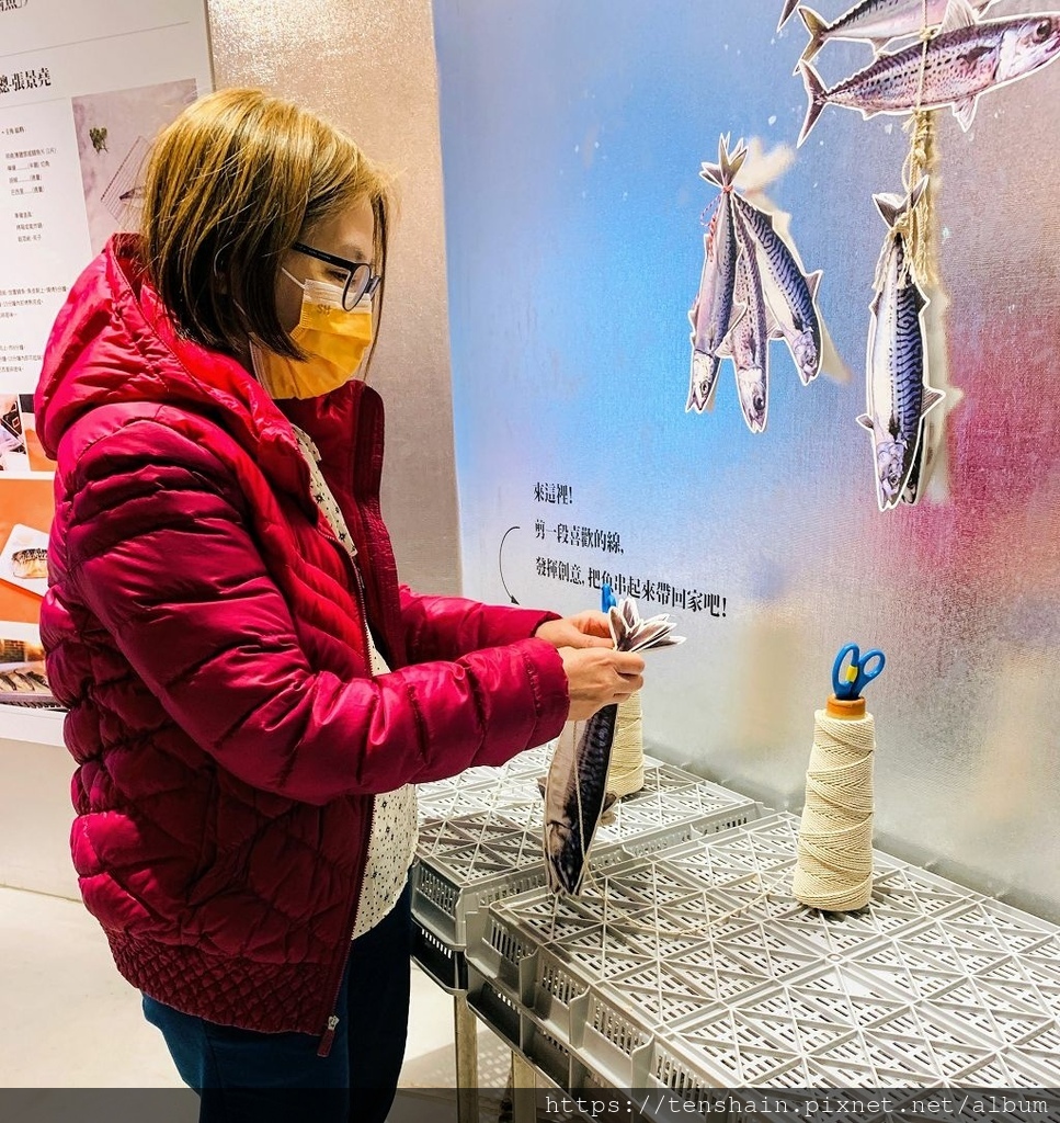 一樓有個有趣的活動:「拿起魚籃找魚去」,先拿一個魚籃,到「魚牆」上挑選喜歡的鯖魚卡,放進籃子裡。然後再到一樓展區找出另外兩隻鯖魚,最後歸還籃子,並用繩子綁出屬於自己的鯖魚小書就完成了。