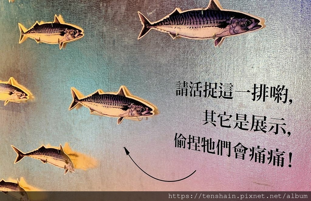 乍看之下,好像每排的魚卡都一樣,但是仔細看,只有一排是可以拿起來的紙卡,其他都是固定在牆上的展品。