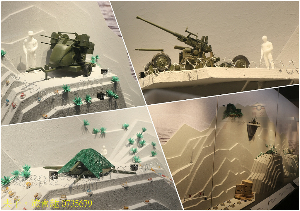 配合牆面的防線佈署說明圖表,一個動態模型模擬敵軍來襲,北竿島的「鋼邊」軍事佈署進行立體作戰,觀測站通報敵船位置,火力部隊立即進行火砲射擊,向遊客呈現「島嶼戰略」。