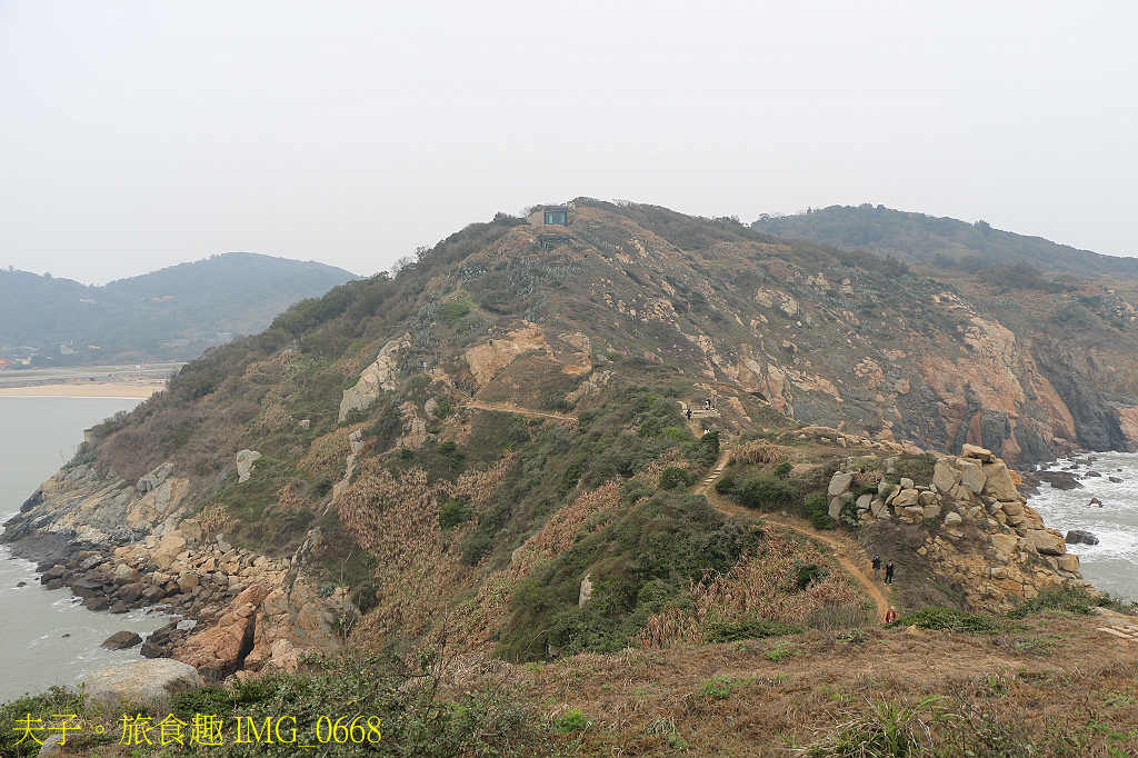 回望來時路,山崖高處的迷彩建物就是 12據點,中段為「三連嶼」展望台。