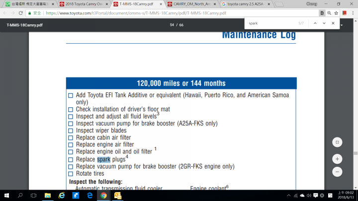 下面是2018 美國Camry 2.5直噴引擎(A25A-FKS)的火星塞更換週期: 12萬mile(19.3萬公里)/12年, 給VW車主參考看看.