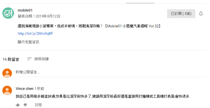 我的經驗也是蒂克潔牙粉會刮傷玻璃,因為裡面有顆粒。自己用過黑人牙膏最好;最傳統的黃色軟管包裝效力最強(刷牙後的牙齒可以證明)。把玻璃弄濕塗抹牙膏均勻後刮除即可。擋風玻璃因為迎風面的設計所以會沾上小蟲屍體、灰渣等雜物,趁塗抹牙膏同時用新的美工刀片順著玻璃走一遍除了去除油膜外還可以除掉玻璃上的點點。