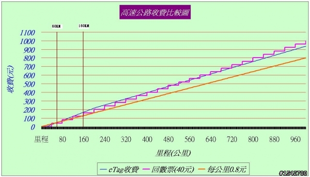 如果加入「無免費里程,每公里收0.8元」來比較:60公里以前,每公里收0.8元較預備上路的eTag費制貴;60公里以後,每公里收0.8元較預備上路的eTag費制便宜;160公里以後,每公里收0.8元一定比回數票便宜。