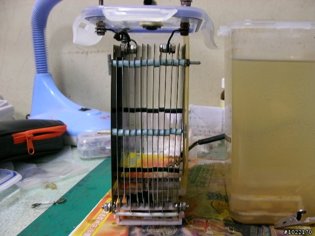 2.那極板的排列是否仍有其它方法呢? 當然有.極板串聯使用.極板串聯使用可達到分壓的目的.以並聯使用而言.只能加大反應器極板面積.並無分壓作用.但串聯使用就可分壓.將極板電壓降下來.但串聯使用如在同一個容器內使用.會因電解液的導電作用.將電力旁路掉.沒有作用在極板上.造成能量的損失.所以最好的方法就是隔間使用(開小房間.....)---將容器分成幾個隔間與汽車電池中的隔間作用相同.這樣就可以達到降低電壓.減少溫度.與增長使用極板壽命.