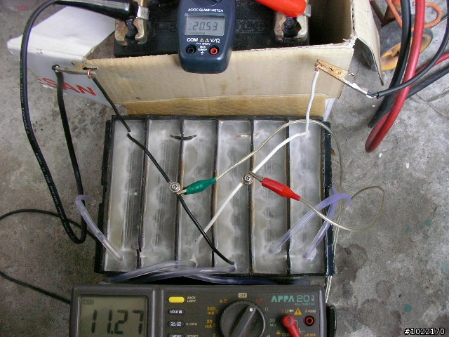 1.不銹鋼電解板的外加電壓使用車上電池 12 伏特電瓶---大家都知道電解的電壓是 1.23伏特.那您加 12 伏特的電壓在電解板上只是將 Hydrogen reactor 當電湯匙用.將電解水加熱煮沸.如果注意國外的作法.都應該可以發現一個名詞 Neutral plates (中性電極板)----就是這些在正極板與負極板中間的 neutral plates 並不加上任何電極 (沒有正電壓或負電壓 )單純只是在在電正負電極中間.它的作用為何? 在正負電極板中間的 Neutral plates 會因為電解液的作用而將電性串聯在一起. 如 (電極 - n + ), 用電壓計測量極板電壓可得 0v,6v,12v.沒加上電壓的 Neutral plates (中性電極板) 一樣可量到 6 v 的電壓.您也可以看到上面一樣會產生(氫或氧)氣泡.很神奇吧.如果覺得每片極板電壓仍太高 6v.那您可以再多加幾片 Neutral plates (中性電極板) .達到分壓的作用.但我作過的實驗中 5片後效率就變差了.