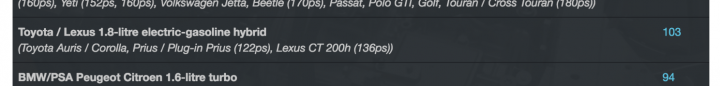 從圖表中可以看到,Ferrari共有一款渦輪增壓與自然進氣引擎入選,而包括第二名的BMW 1.5升三缸Hybrid引擎、第四名的PSA集團1.2升三缸渦輪增壓引擎、第五名的Ford開發的1.0升三缸渦輪增壓引擎、第六名的M.Benz 2.0升四缸渦輪引擎與第八名的Audi 2.5升五缸渦輪增壓引擎皆是去年榜中有名的熟面孔,我們也會在文章中一一介紹。(註:圖表中的動力輸出數值,由於換算單位的差異,因此會與內文中提到的數值稍有差異。)