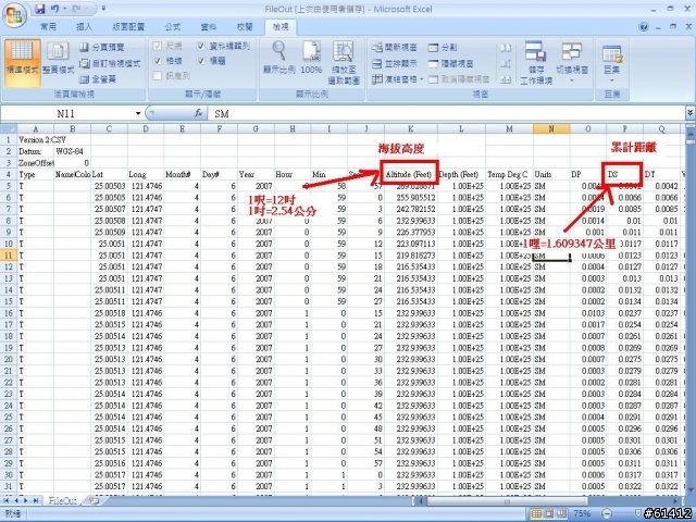 gdb可以轉csv(for excel)csv也可以轉gdb,但要注意其欄位的對應樓主可以使用G7ToWin 試試看以下為個人於春假期間前往6號花園 軌跡及高度圖表Google EarthMapsourceExcel(折線圖自己製作即可)