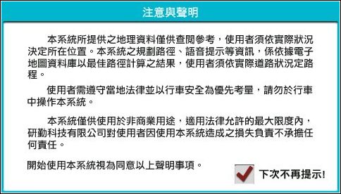 注意與聲明畫面,每次重開機都會顯示如果覺得麻煩可以選擇"下次不要再提示!":