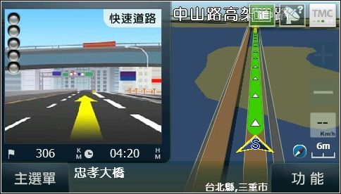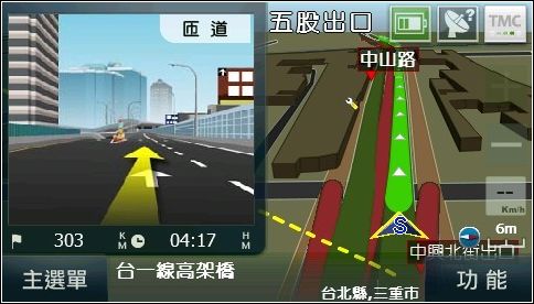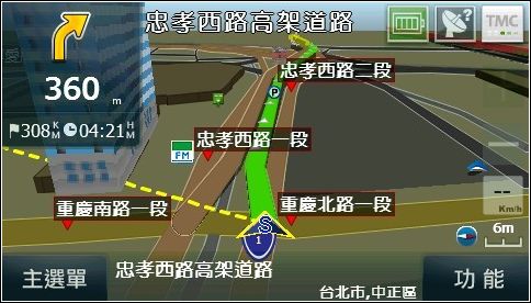 在經過高架橋等複雜地形時PAPAGO的立體圖資就發揮了他的效果,可以由下圖看出現在走的路線是穿越高架橋下方的道路,上方兩旁的閘道也可以讓使用者分辨該道路為平面道路或是立體高架橋(這部份在前一版圖資其實就有此功能了):