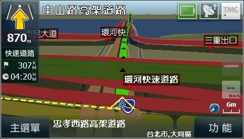 最後是PAPAGO!7最新導入的DEM(數位地理模型)技術,可看到道路兩旁的地形隨著實景有高低起伏的變化,這也是增加導航過程辨識度的小功能: