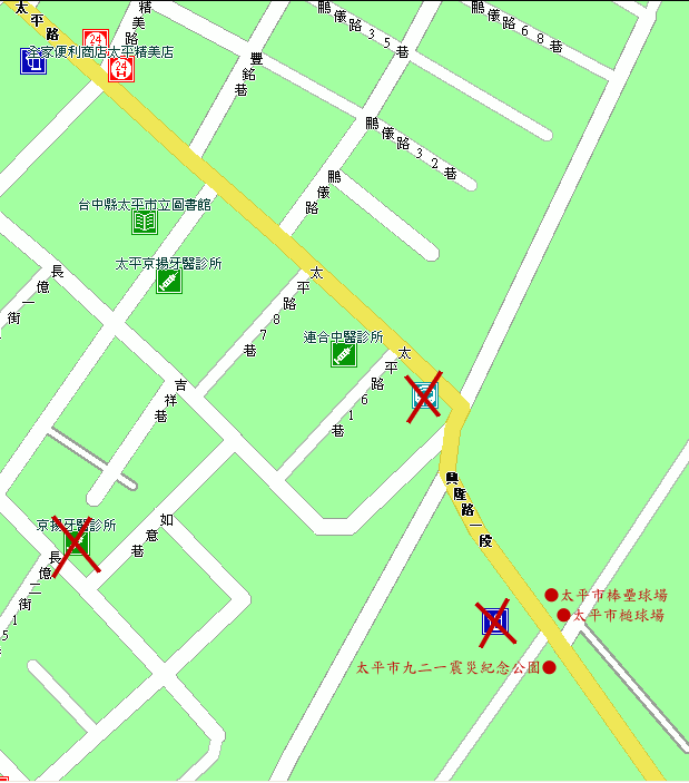 台中縣太平市九二一震災紀念公園附近的景點錯誤回報:以下是用景點搜尋的關鍵字來查的紅色X的 東京撞球場,沒有這個地方。請刪除紅色X的「京揚牙醫診所」錯誤,請刪除。但另一個「太平京揚牙醫診所」則正確,不要刪錯了!。紅色X的「中油加油站」,沒有這個地方。但那附近的「中油太平長億路站」則正確,不要刪錯了!。另外,可新增一些較大較知名的景點地標:●太平市九二一震災紀念公園 (號稱太平市最大的公園,不知真的假的?)●太平市棒壘球場●太平市槌球場圖中紅色圈圈 ● 是地標位置