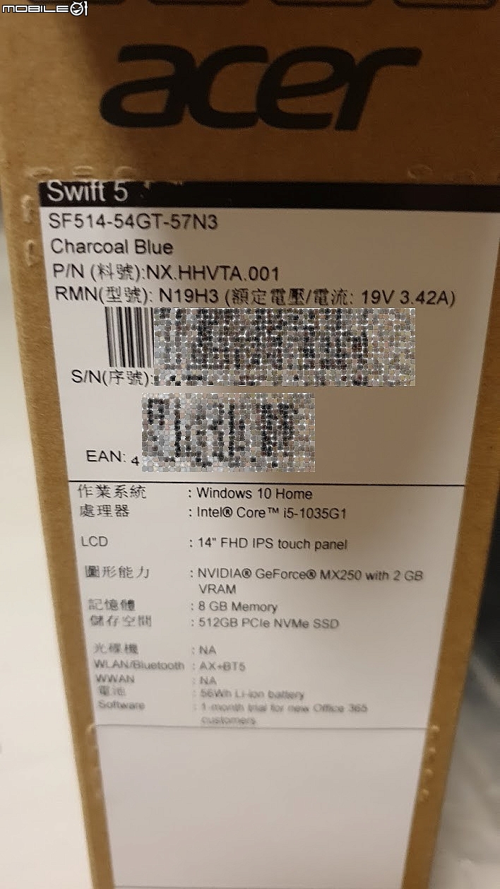 那個.....不是故意澆您冷水讓你失去開箱的愉快就當作我的acer Swift 5 SF514-54GT是個案吧可能是我比較挑剔,除了螢幕、SSD、MX250差強人意外這是一台好NB附上人權面板料號型號SSD型號MX250 設備代號 1D52忘了拍照抱歉