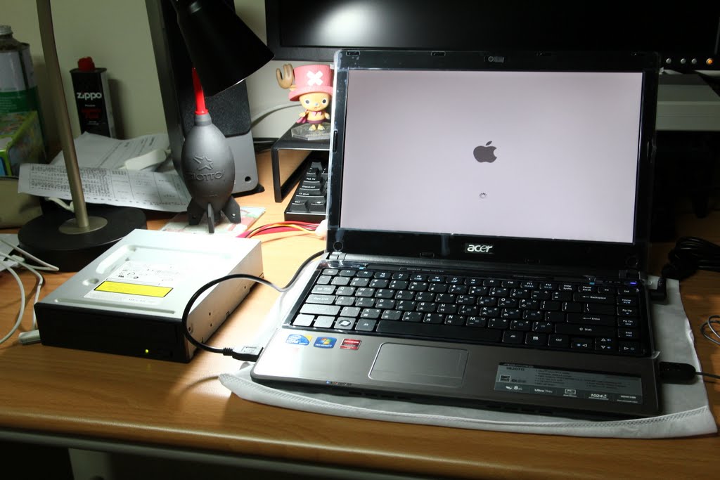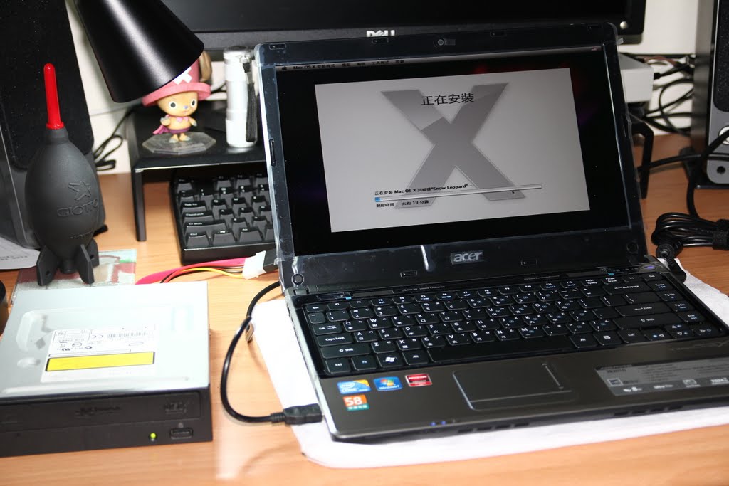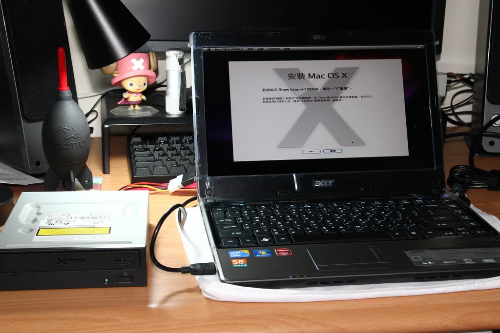 給我電腦用就是要來惡搞一下啦~~在PC上灌MAC OS X一下,左邊那台是一般光碟機+SATA轉USB湊合的外接式光碟機